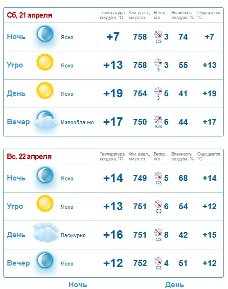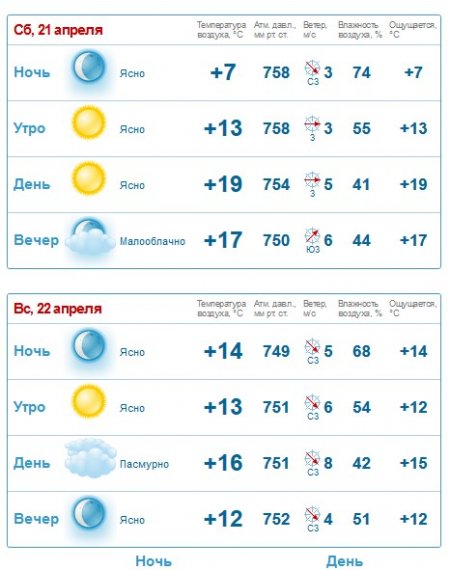 22 квітня вітер знову розвернеться на північно–західний, 7–12 м/с, температура повітря вночі +6°C...+11°C, вдень - +13°C...18°C.