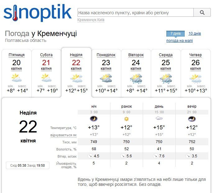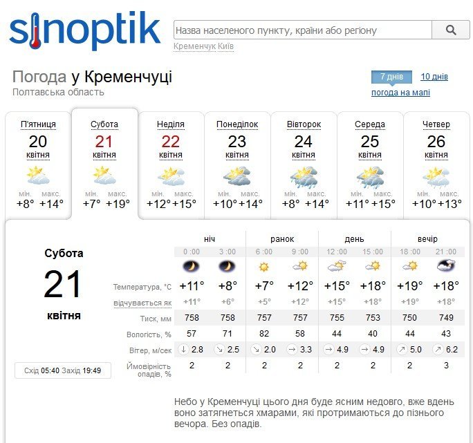 Sinoptik обіцяє кременчужанам ясну та сонячну погоду лише ранками, а післяобід і в суботу, 21 квітня, і в неділю, 22 квітня, небо затягнуть хмари. Але опадів чекати не варто. Температура повітря триматиметься на рівні +7°C…+19°C.