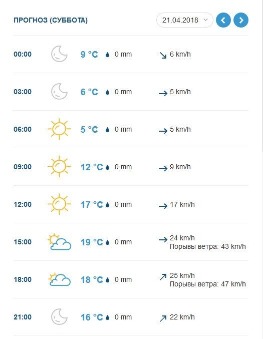 За прогнозом Ventusky, у суботу, 21 квітня, повітря у Кременчуці прогріється до +19°C. Буде сухо і ясно. Без опадів. Пориви вітру до 13 м/с.