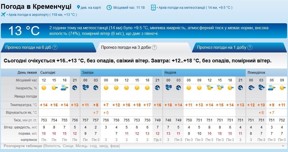 Теплий вікенд прогнозує кременчужанам rp5. Також тут нас попереджають про пориви вітру до 16 м/с. Мінімальна температура повітря – +7°C, максимальна – +19°C. Без опадів.