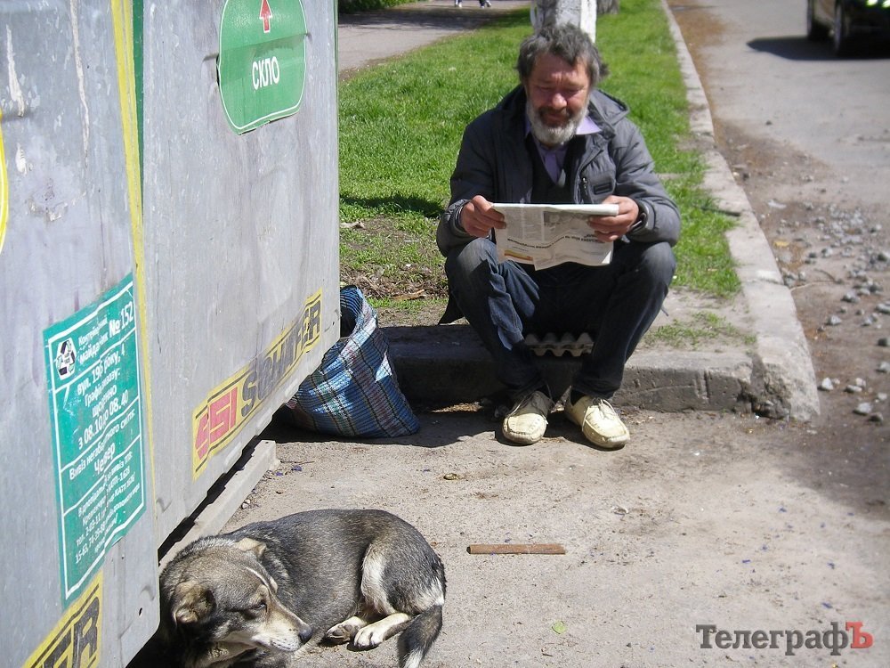 Кременчуг. Пятница. Весеннее утро. Возле мусорных баков мужчина без определенного места жительства вдумчиво читает газету. Вчера был дождь, поэтому он устроился не на газоне, а на аккуратно сложенных стопочкой лотках от яиц. Рядом лежит пес, время от времени вздыхает.