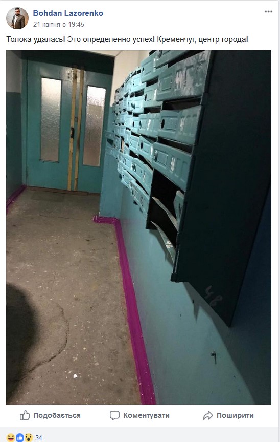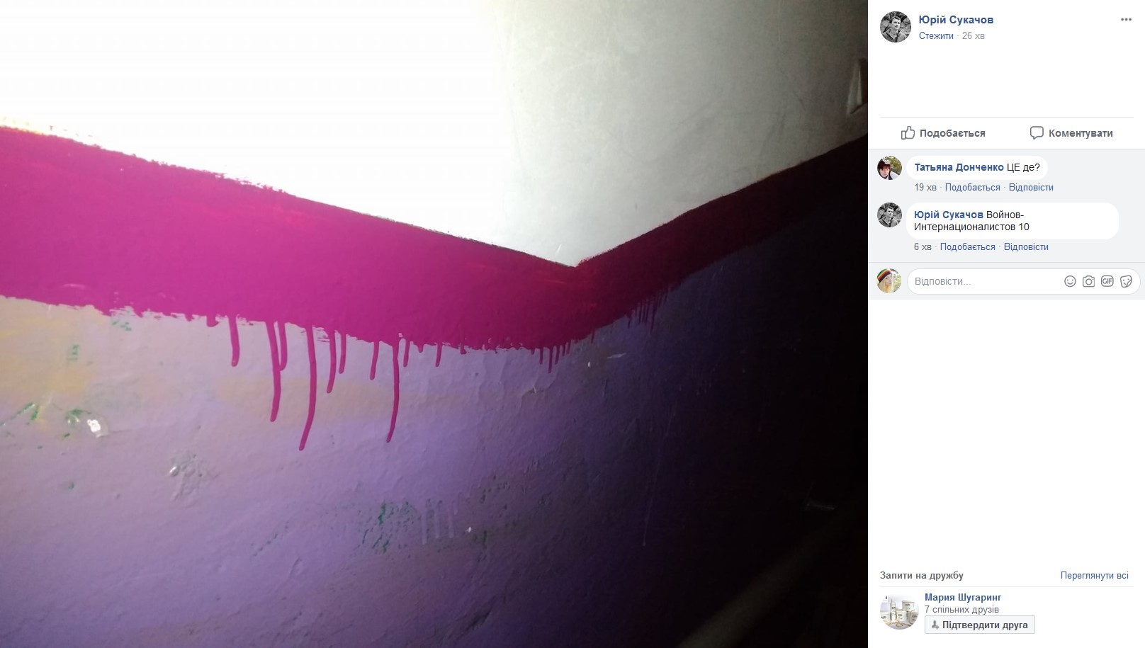 - Так кілька років назад вирішили пофарбувати двері. Обробили двері знежирювачем, здерли частинки фарби наждачним папером і лише після цього почали фарбувати двері. Три дні до цього вирізали трафарет, склеювали частинки… До справи підходили серйозно, адже двері – це обличчя під’їзду, які кожного ранку просаджали наших сусідів на роботу та школу, а ввечері першими зустрічали втомлених сусідів. Хотілося людям, які завжди нам приходили на зустріч, допомагали, подарувати посмішку, - пишет Алёна. - Гранатова толока для нас стала дійсно вибуховим божевіллям. Вони пофарбували все, що тільки можна. Двері - це взагалі окрема історія. Вони не обробляли двері, а по бруду нанесли фарбу. Фарба всюди: від домофону, стіни, підлоги до петель які згодом не дозволять дверям нормально зачинятися. Тепер живемо в будинку Барбі з рожевими дверима, які пофарбували для галочки:(