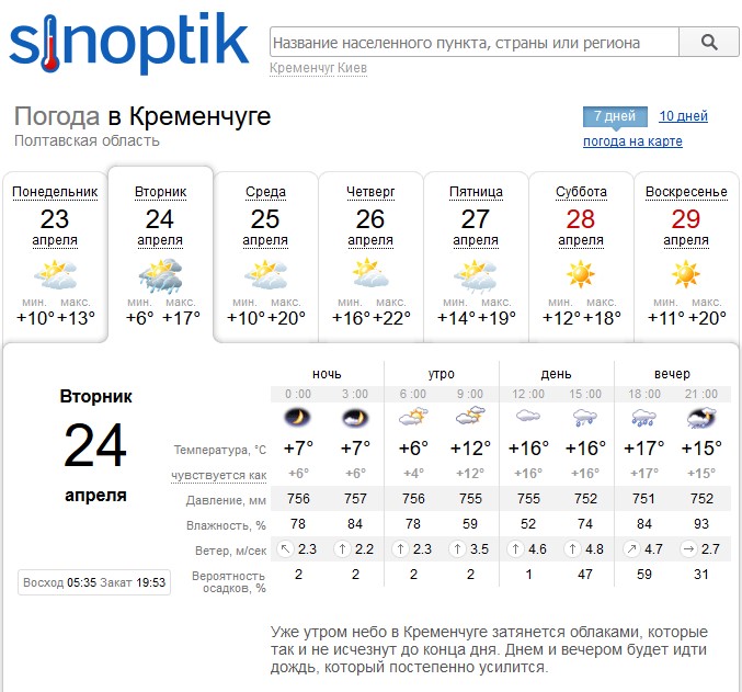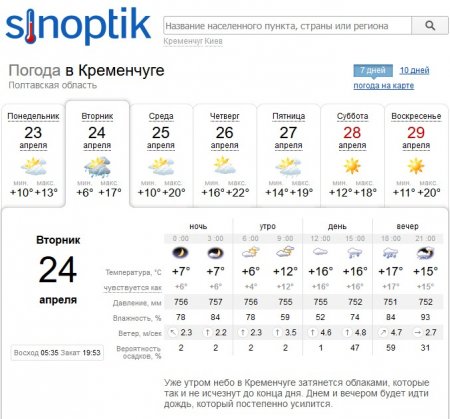 На Gismeteo кременчужанам прогнозують дощ щодня, крім вихідних, 28-29 квітня. У п'ятницю, 27 квітня, варто бути готовими до грози. Температура повітря коливатиметься від +5°C до +23°C.