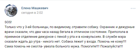 О том, что собака с явными признаками отравления пришла просить помощи у людей к приемному отделению больницы написала в группе Защиты животных Елена Машкевич в 2.00 ночи: