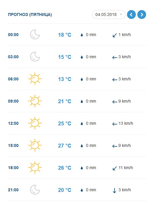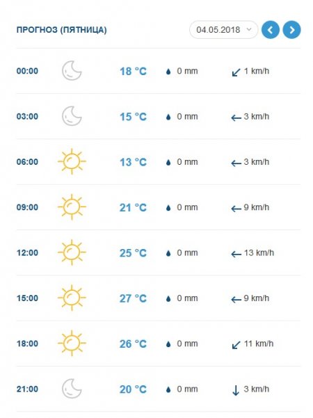 На rp5 нас попереджають, про невеличкий дощ у неділю, 6 травня. Погода буде вітряною, але не надто - пориви сягнуть 9 м/с. Максимальна прогнозована температура повітря +28°C, мінімальна - +14°C.