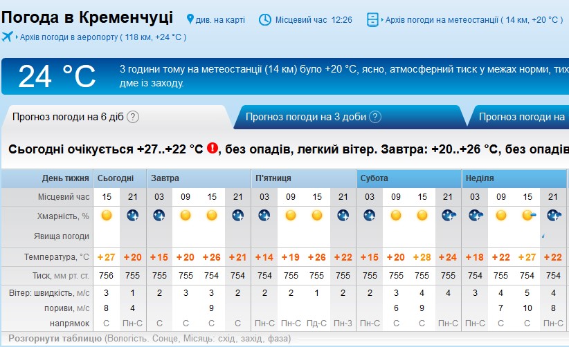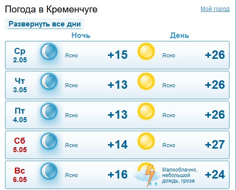 На Gismeteo кременчужанам прогнозують грозу уже у неділю, 6 травня. Усі інші дні будуть сонячними і ясними. Температура повітря коливатиметься від +13°C до +27°C.