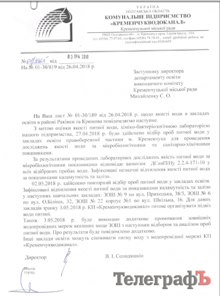 Кременчугский водоканал признал, что в школах №№ 6; 9; 22 на Правобережье зафиксировано превышение показателей мутности и содержания железа в водопроводной воде. Об этом свидетельствуют анализы воды в школах. Пробы воды на анализ водоканал брал 27.04.2018 и 02.05.2018. О результатах исследований сегодня, 3-го мая, директор водоканала В. Солодяшкин уведомил официальным письмом городское управление образования.