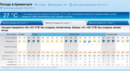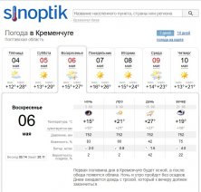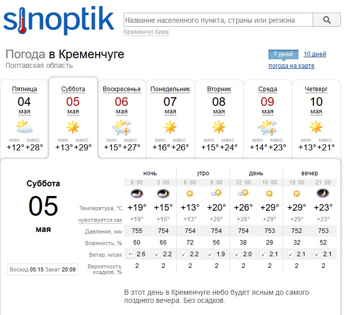 Теплий вікенд прогнозує кременчужанам rp5. Також тут нас попереджають про помірно-вітряну погоду - пориви вітру до 9 м/с. Мінімальна температура повітря - +15°C, максимальна - +29°C. у неділю, 6 травня, накрапатиме мілкий дощик.