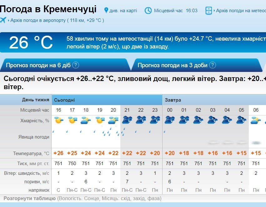 rp5 попереджає про зливу до кінця дня та пориви вітру до 7 м/с.