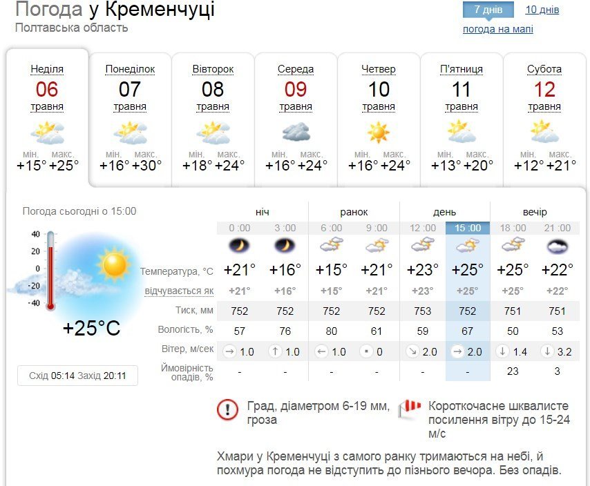 А sinoptik прогнозує град, діаметром 6-19 мм, грозу та короткочасне шквалисте посилення вітру до 15-24 м/с.