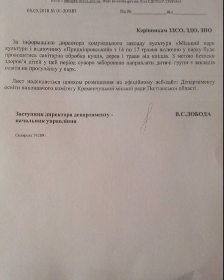 Нагадаємо, що минулого року школярі гуляли по Придніпровському парку, не дивлячись на те, що там у цей час труїли кліщів.