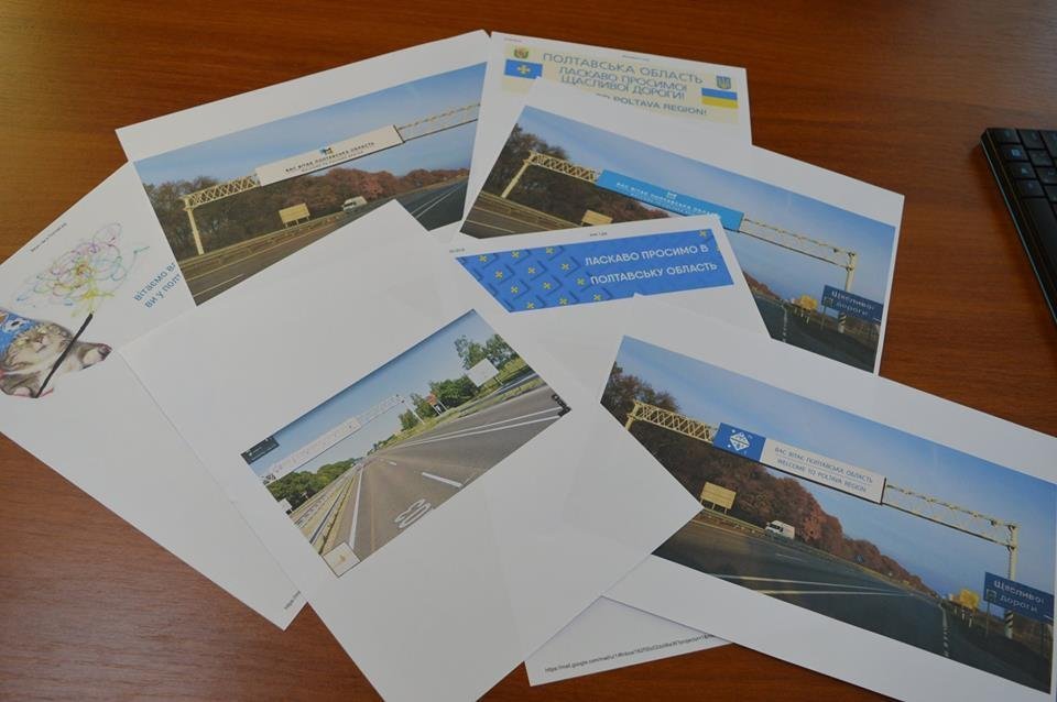 Серед 10 запропонованих ескізів були: зображений котик вжух вжух з написом: «Вітаємо Вас ви у Полтавській області», «Ласкаво просимо у Полтавську область» та «Полтавська область ласкаво просимо! Щасливої дороги!»
