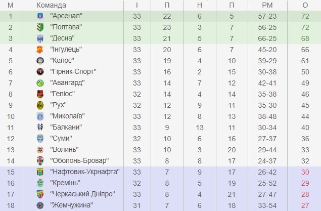 «Арсенал» обіграв на виїзді «Суми», а полтавці зіграв у нічию мають в своїх активах по 72 очки. За рахунок кращої різниці м’ячів (на +3) «Арсенал» займає першу сходинку.