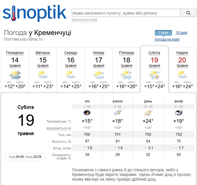 Sinoptik прогнозує кременчужанам дощ у п'ятницю, 18 травня, та грозу у суботу, 19 травня. Максимально тепло, до +26°C, буде у п'ятницю, 18 травня.