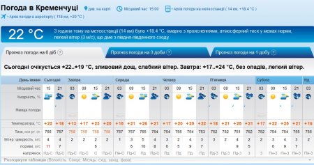 За прогнозом rp5, ледь не кожен день день у Кременчуці починатиметься з серпанку, а у п'ятницю-суботу, 18-19 травня, варто бути готовими до злив. Мінімальна прогнозована температура повітря - +13°C, максимальна - +26°C.