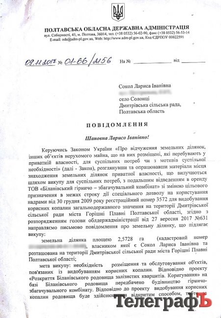 В декабре 2017-го «ТелеграфЪ» писал о том, что Полтавская обладминистрация пытается выкупить у Ларисы Сокол упомянутую земельную делянку. В сентябре 2017-го было издано распоряжение № 631 «Про викуп земельної ділянки у громадянки Сокол Л. І. для суспільних потреб». Выкупать землю чиновники решили в связи с соответствующим обращением Белановского ГОКа, которому нужен участок, принадлежащий Ларисе Сокол.