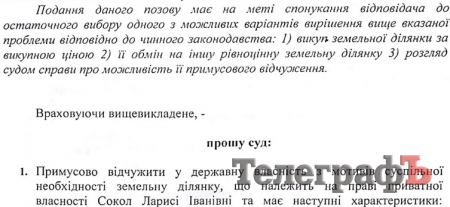 Полтавская областная государственная администрация обратилась в Харьковский апелляционный административный суд с иском о принудительном отчуждении земельной делянки, находящейся в собственности Ларисы Сокол, для потребностей Белановского горно-обогатительного комбината. Аутентичное название иска: «Позов про примусове відчуження земельної ділянки з метою суспільної необхідності».
