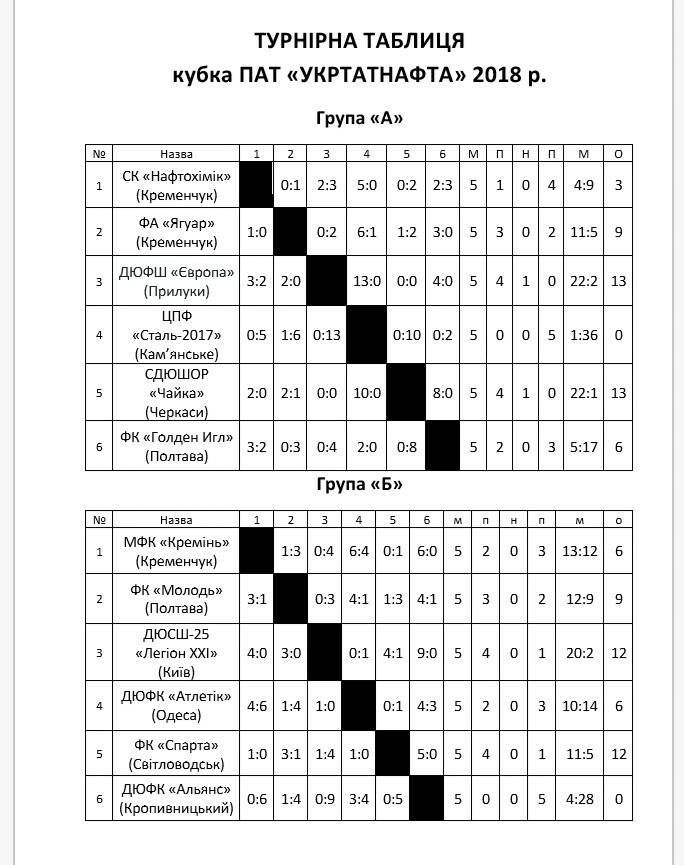 Підсумкові результати Кубку «Укртатнафти»: