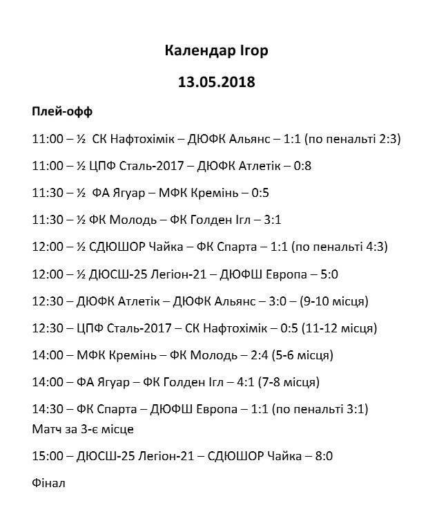 Головний кубок змагань завоювала команда СДЮШ-25 «Легіон 21» Київ, яка в фіналі обіграла СДЮШОР «Чайка» Черкаси з рахунком – 8:0. Третє місце турніру зайняли футболісти ФК «Спарта» Світловодськ.