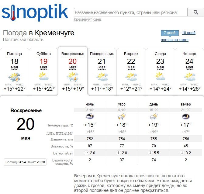 Sinoptik обіцяє кременчужанам, що у суботу, 19 травня, день мине без опадів. Температура повітря досягне +22°C. У неділю ж, 20 травня, спека спаде +19°C, небо затягнуть хмари. Зранку очікується дощ з грозою.