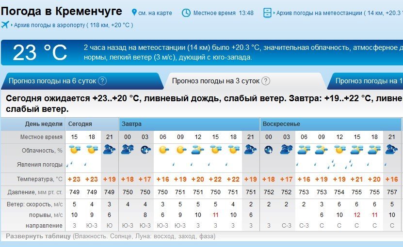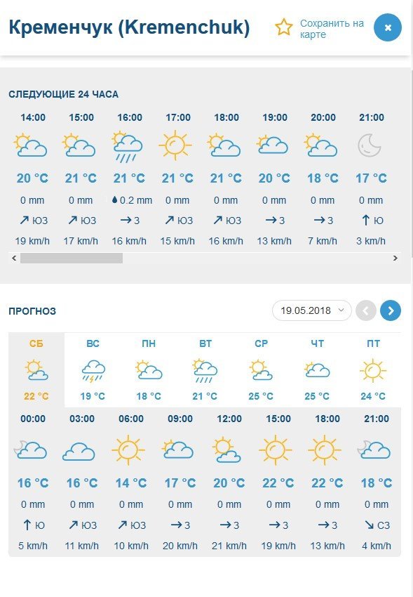 Rp5 попереджає кременчужан про дощ, який почнеться вдень суботи, 19 травня, припиниться вночі, але з новою силою піде у неділю, 20 травня. Буде вітряно – пориви до 12 м/с. Мінімальна температура повітря – +16°C, максимальна – +22°C.
