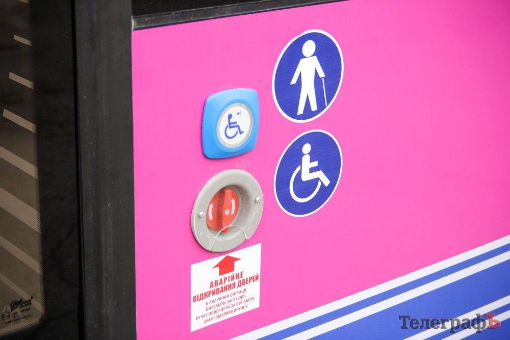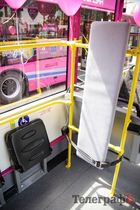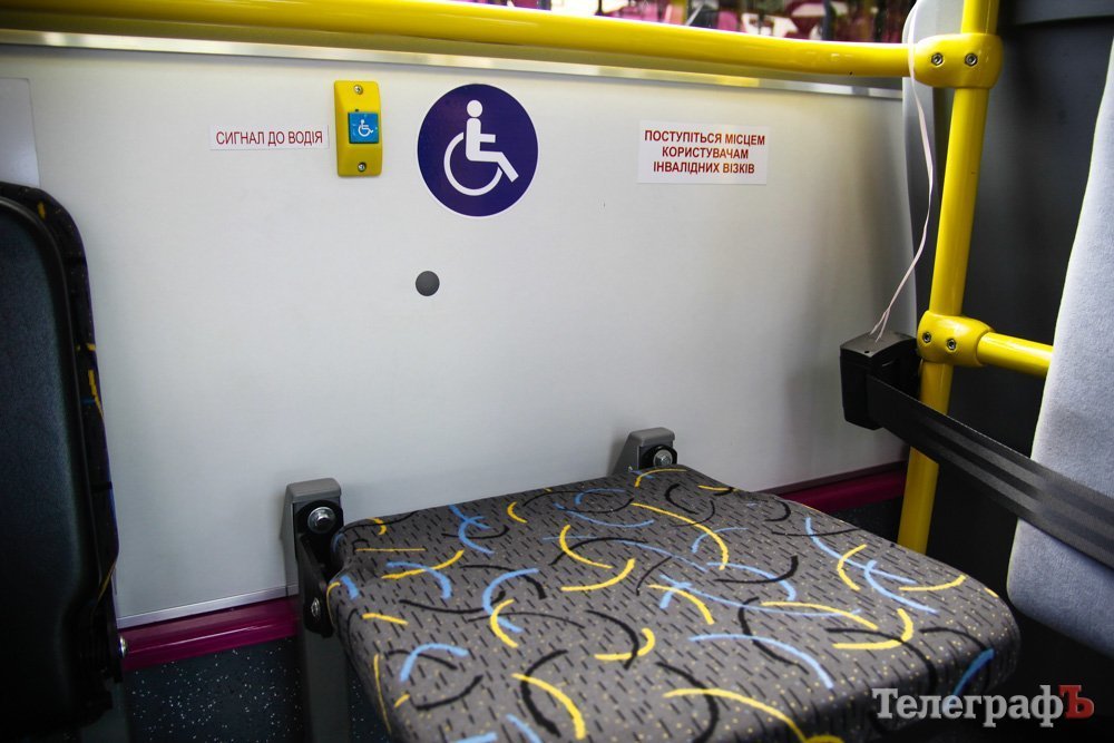 - Є два майданчики для дитячих колясок та людей з інвалідністю. Тролейбус обладнаний пандусом та кріпленням для фіксації інвалідного візка в салоні. На входах є кнопка звукового сигналу до водія для людей з інвалідністю (є дубляж напису шрифтом Брайля).