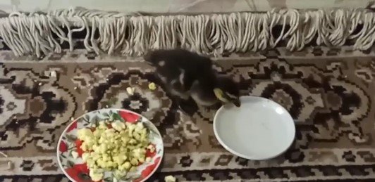 Тепер каченятко живе вдома у директора міськсаду і товаришує з домашнім котом.