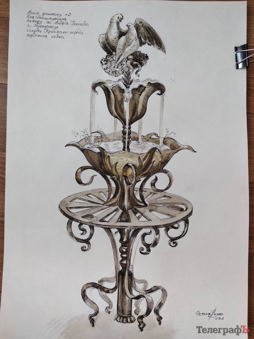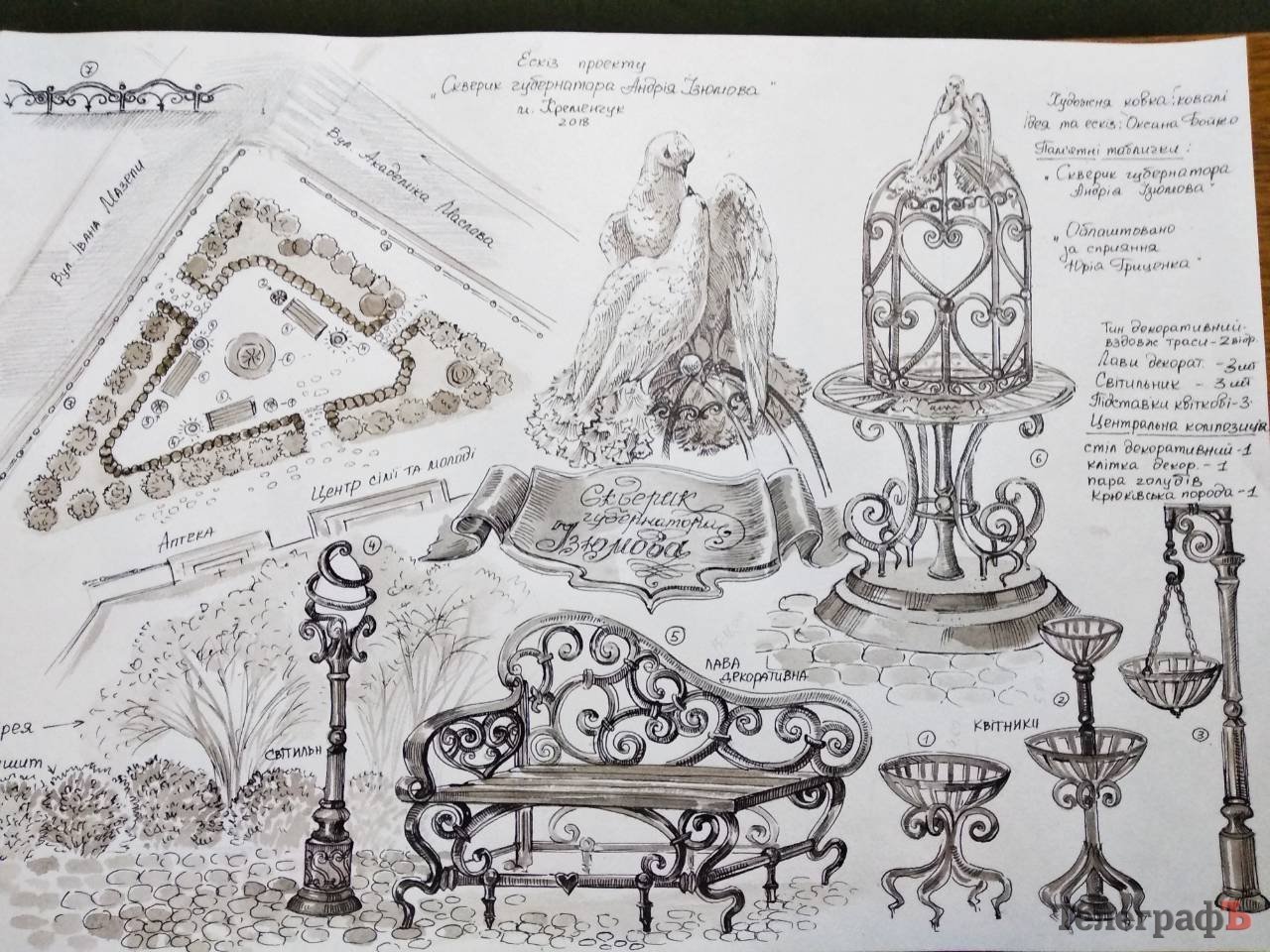 Оксана Бойко также рассказала, что, по её задумке, сквер украсят кованные лавки и миниатюрный фонтан с двумя воркующими голубками кременчугской породы, выведенной Андреем Изюмовым.