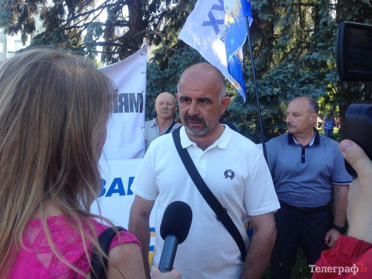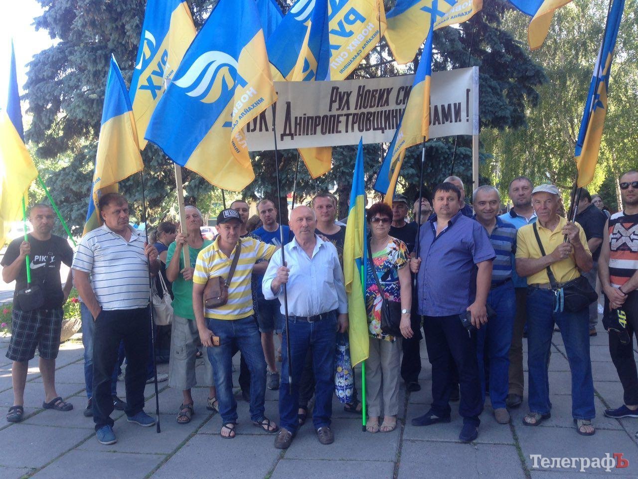 В среду, 30 мая, перед началом сессии возле здания горсовета на акцию протеста собралось около 50 человек. В руках они держали знамена партии депортированного Саакашвили «Рух Нових Сил» (РНС). Организовала митинг кременчугская парторганизация РНС. Он прошел в поддержку члена РНС Олега Филипаса, избитого неизвестными злоумышленниками.