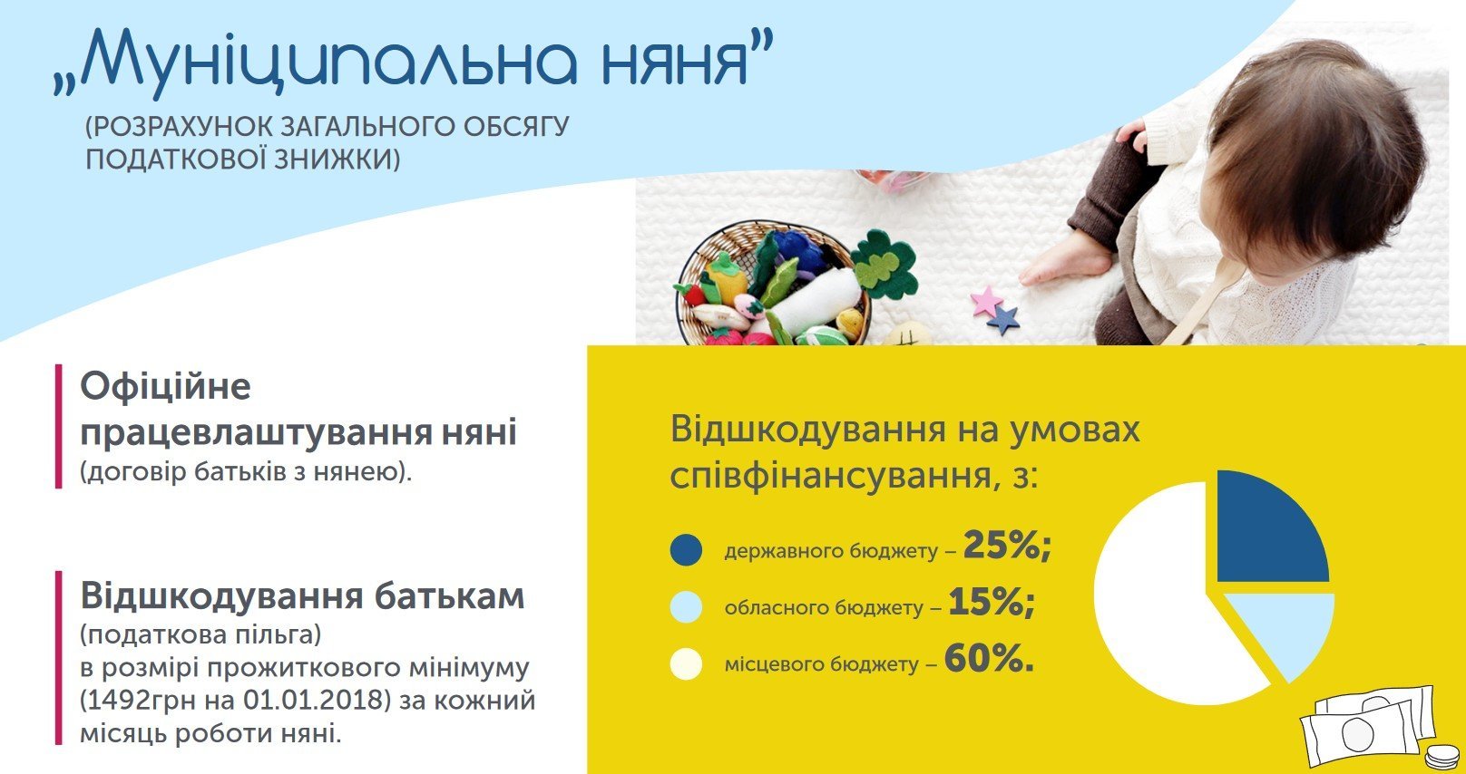 У Мінсоцполітики називають механізм прозорим та простим – батьки наймають няню офіційно, самостійно обираючи спеціаліста та визначаючи умови контролю її роботи, а на кінець року отримують відшкодовання за кожен місяць роботи няні в розмірі прожиткового мінімуму на дітей віком до шести років (зараз це 1492 грн).