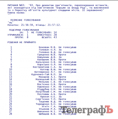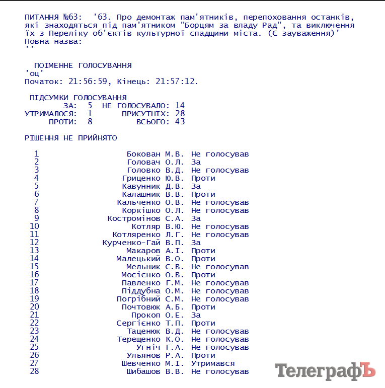 30-го мая в 21.56 (это не опечатка – сессия 30-го мая закончилась в 23.04) проект решения о демонтаже обоих памятников и перезахоронении останков поставили на голосование. Депутаты его не поддержали. За демонтаж проголосовало лишь пятеро: Головач, Кавунник, Костроминов, Курченко-Гай, Прокоп. Против проголосовал мэр Кременчуга Виталий Малецкий и секретарь горсовета Юрий Гриценко, а также ещё шесть депутатов (таблица голосования ниже). 14 депутатов не голосовали.