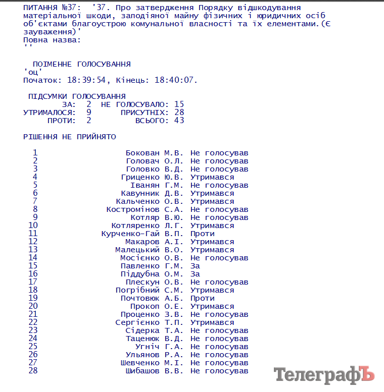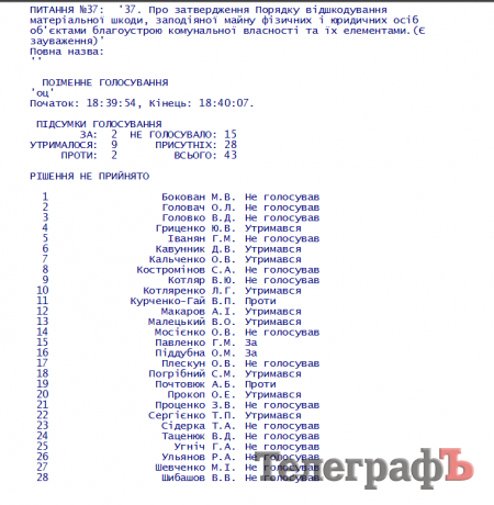 Это своего рода уникальное голосование – за компенсацию материального ущерба кременчужанам проголосовали только два депутата – Пиддубная и Павленко. Правда и против тоже проголосовали только два депутата – Курченко-Гай и Почтовюк. Ну, почему депутат Почтовюк против, неизвестно – он профессор, ему компенсировать ущерб, нанесенный по вине коммунальных служб, не придется. А почему против депутат Курченко-Гай, вполне можно понять – депутат теперь работает в УЖКХ, а речь в проекте Пиддубной идет о недоработке именно жилищно-коммунальных служб. Так что тут депутат по определению не мог поднять руку. Остальные депутаты как-то выкрутились – кто-то не голосовал, кто-то воздержался.