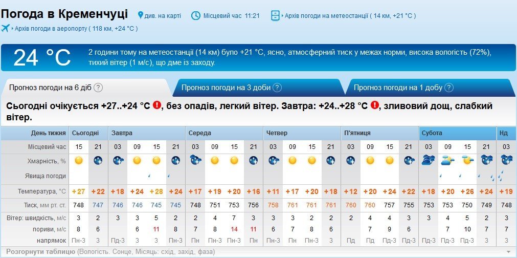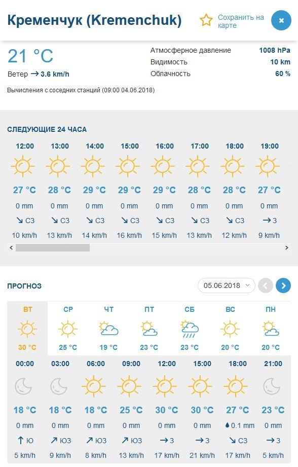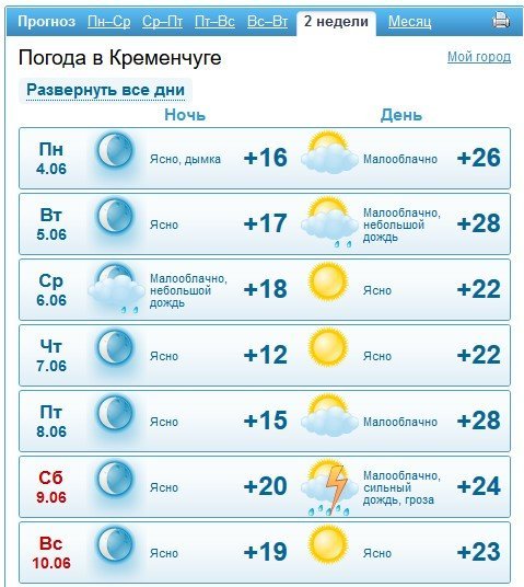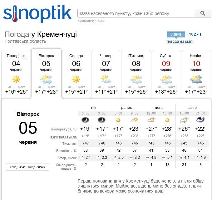 Rp5 попереджає кременчужан про можливі опади у вівторок, 5 червня, та у вихідні, 9-10 червня. У вівторок, 5 червня, та середу, 6 червня, здійметься сильний вітер з поривати до 14 м/с. Максимальна прогнозована температура +28°C, а мінімальна – +11°C.