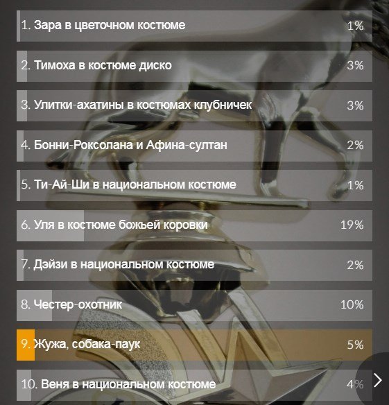 2. Тимоха в костюме диско — хозяйка Прокопенко Маша (№7). Маша с сестрой и питомцем не в первый раз участвуют в конкурсе, они представили своего любимца в стихах.
