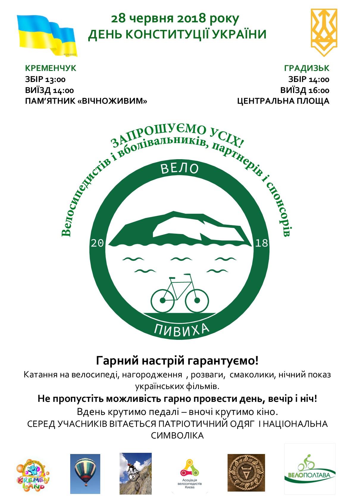 Кременчужан запрошують стати учасниками велопробігу «Пивиха – Вперед та вгору». У рамках відзначення Дня Конституції України 28 червня відбудеться велопробіг за маршрутом Кременчук-Градизьк-гора Пивиха. Організатором заходу є ГО «Центр громадських ініціатив «Корба».