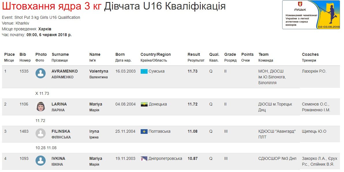 Вихованка КДЮСШ «Авангард» Ірина Філінська стала третьою у штовханні ядра вагою 3 кг. Під керівництвом тренера Юрія Щипця Ірина метнула ядро на 11,50 метрів. «Золото» завоювала Марія Ларіна з Донеччини, її результат - 13,63 м, на другому місці Марія Івкіна з Дніпропетровської області - 11,61 метрів.