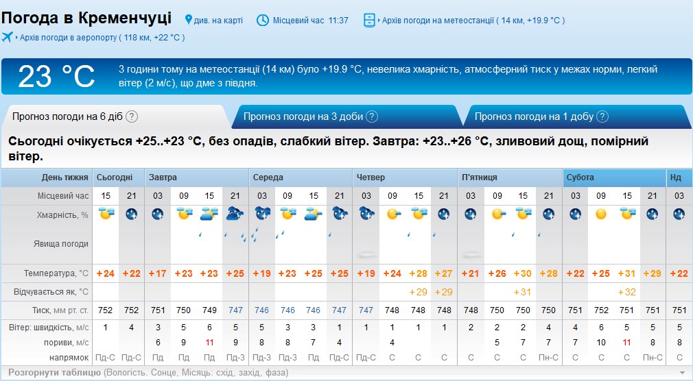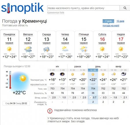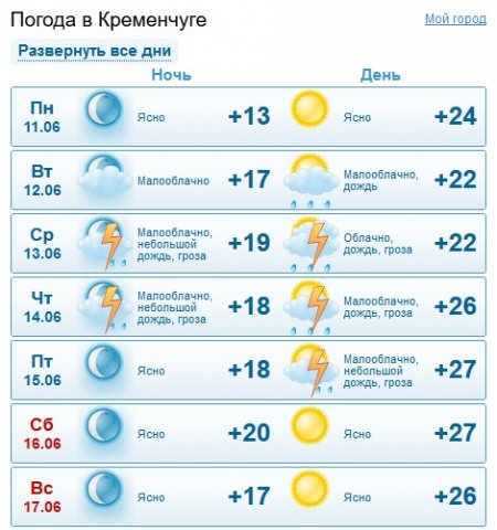 Rp5 попереджає кременчужан про можливу зливу в ніч на середу, 13 червня, та невеликі дощі 14-15 червня. Ранками місто оповиє серпанок. У вівторок, 12 червня, та суботу, 16 червня, здійметься сильний вітер з поривати до 11 м/с. Максимальна прогнозована температура +31°C, а мінімальна - +17°C.