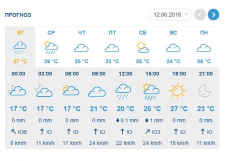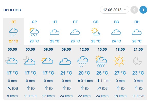 Gismeteo прогнозує, що дощ, який почнеться у вівторок, 12 червня, не припиниться до п'ятниці, 15 червня. В ці дні можливі грози. Стовпчики термометрів вночі не опускатимуться нижче позначки у +12°C, та не подолають відмітки +27°C вдень.