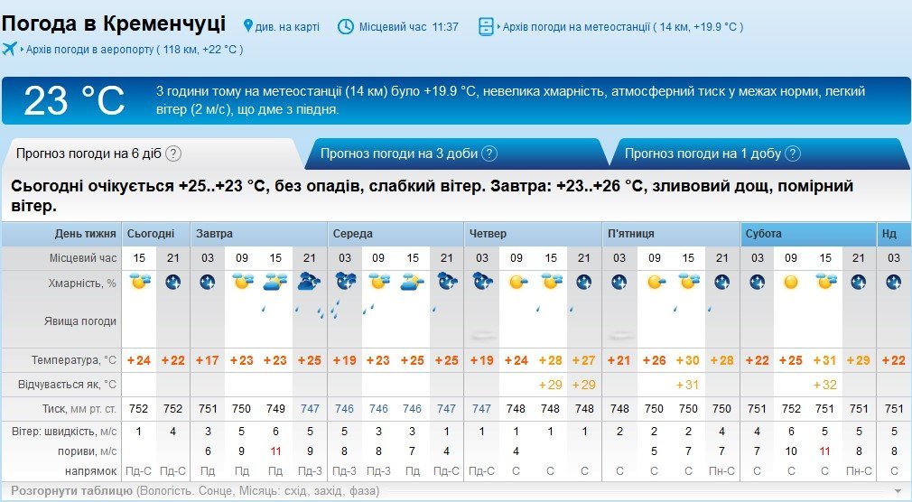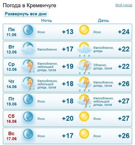 Rp5 попереджає кременчужан про можливу зливу в ніч на середу, 13 червня, та невеликі дощі 14-15 червня. Ранками місто оповиє серпанок. У вівторок, 12 червня, та суботу, 16 червня, здійметься сильний вітер з поривати до 11 м/с. Максимальна прогнозована температура +31°C, а мінімальна – +17°C.