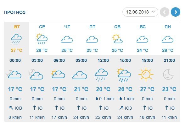 Gismeteo прогнозує, що дощ, який почнеться у вівторок, 12 червня, не припиниться до п’ятниці, 15 червня. В ці дні можливі грози. Стовпчики термометрів вночі не опускатимуться нижче позначки у +12°C, та не подолають відмітки +27°C вдень.