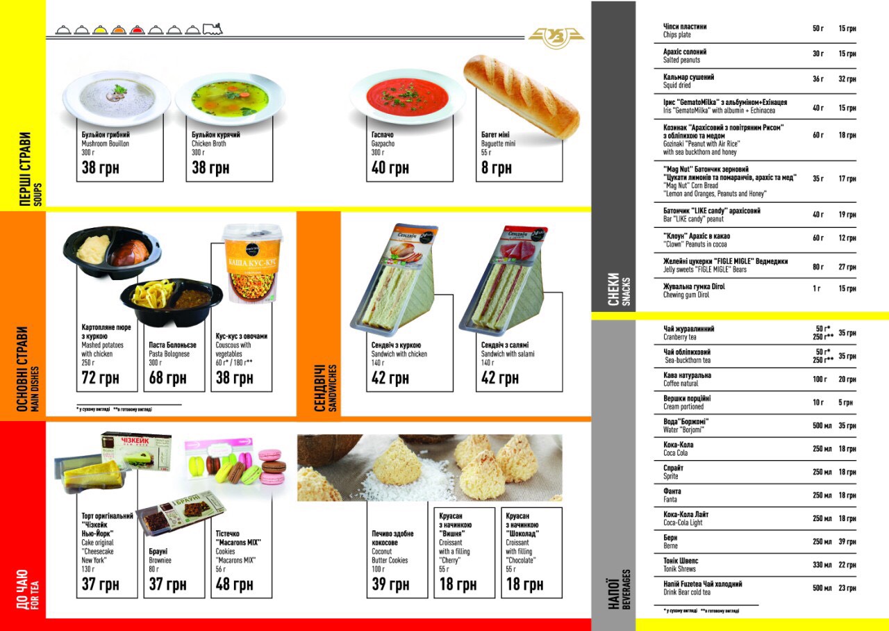 У межах послуги розроблено спеціальне меню, у якому на вибір пасажирам пропонується кілька варіантів: придбати ланч-бокс, який включатиме певний набір страв та напоїв, або обрати за бажанням окремі гарячі страви, снеки та напої.