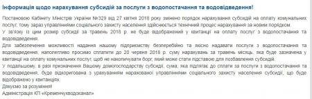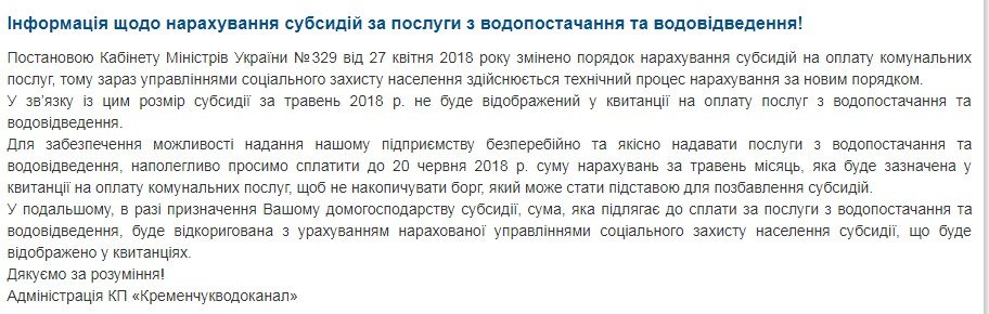Нещодавно на офіційному сайті комунального підприємства «Кременчукводоканал» з'явилася інформація про те, що кременчужани отримають платіжки за травень без урахування субсидій (тобто у квитанціях буде відображена повна сума платежу). Це, дійсно, так, оскільки управління соцзахисту населення станом на травень не отримали всі необхідні довідки про доходи громадян — про це «ТелеграфЪ» повідомляв раніше.