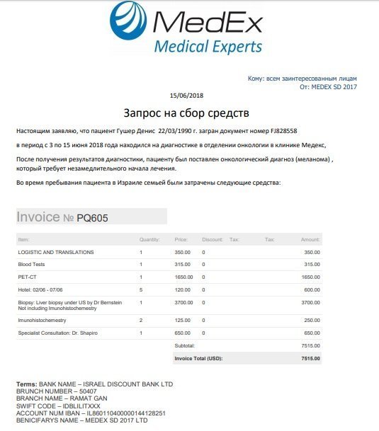 28-річний Денис Гушер захворів на меланому. В Україні на діагностику, щоб підтвердити попередній діагноз була велика черга. Щоб не втрачати дорогоцінний час зробили діагностику в ізраїльській клініці – тепер сумнівів в діагнозі «меланома» немає. Шанси на одужання є. Але потрібні великі гроші на лікування.