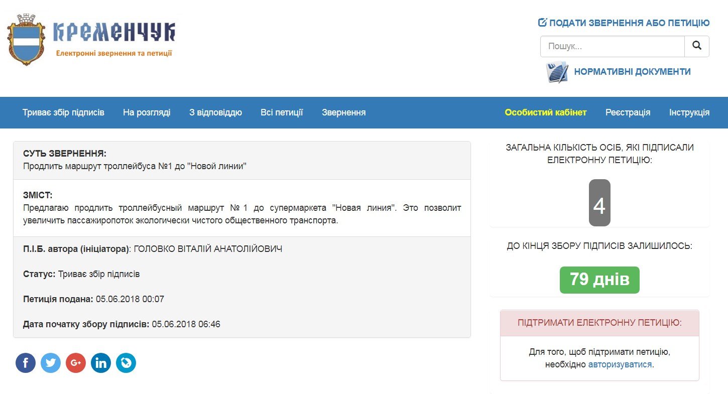 На сервисе электронных петиций мэрии появилось очередное обращение к мэру Кременчуга Виталию Малецкому. Кременчужанин просит городского голову продлить маршрут троллейбуса №1.