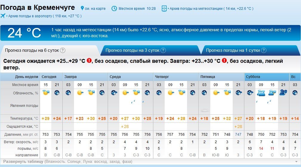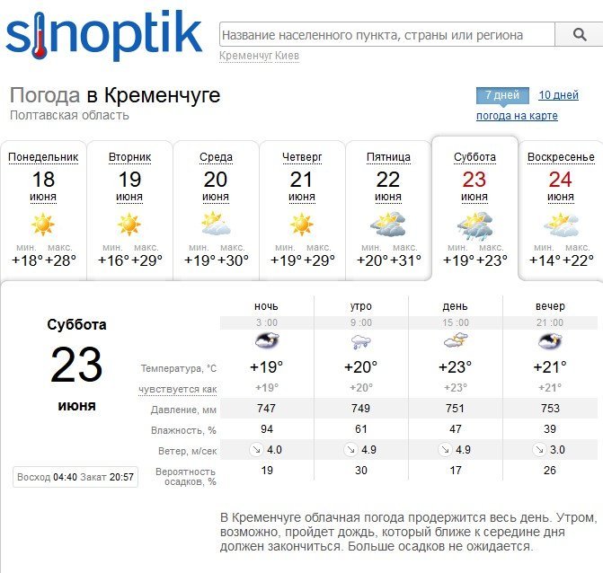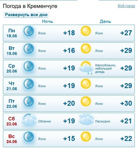 Rp5 попереджає кременчужан про можливі зливи і у середу, 20 червня, і у суботу, 23 червня. Ранком п’ятниці, 22 червня, місто оповиє серпанок. У суботу, 22 червня, здійметься сильний вітер з поривати до 14 м/с. Максимальна прогнозована температура +32°C, а мінімальна – +17°C.