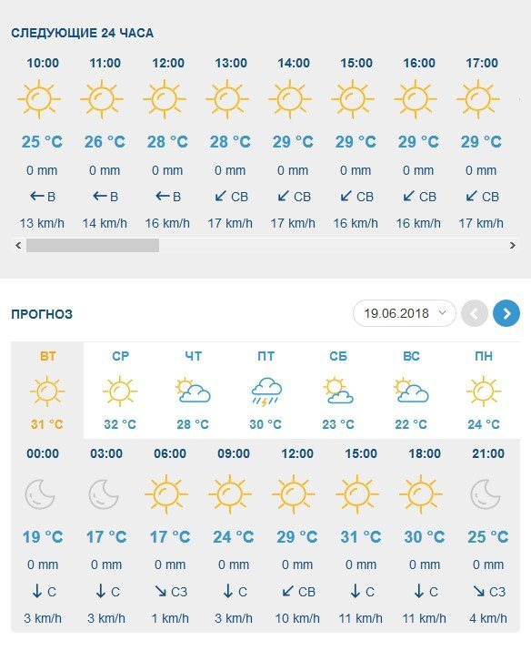 Gismeteo прогнозує невеликий дощ у середу, 20 червня, а в усі інші дні – суху погоду. Стовпчики термометрів вночі не опускатимуться нижче позначки у +16°C, та не подолають відмітки +30°C вдень.