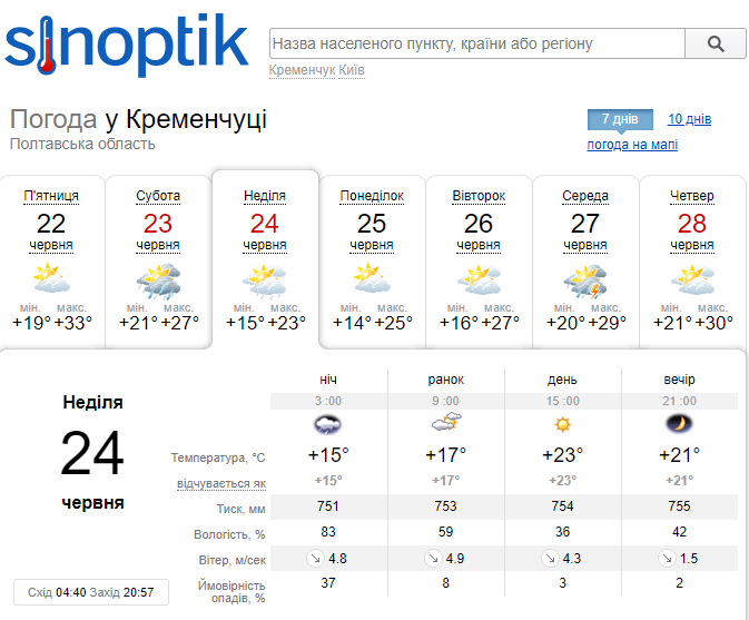 Теплий вихідні 23-24 червня з невеличким дощем вночі прогнозують Кременчуку синоптики.