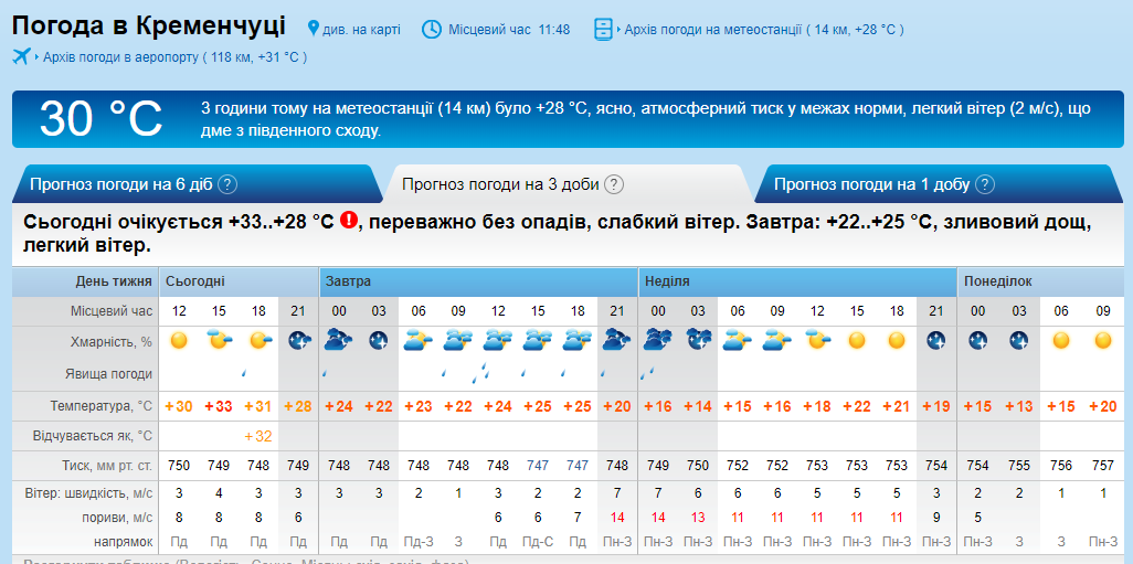 Rp5 попереджає про дощ вночі. Атмосферний тиск у межах норми. Вітер помірний з поривами до 11-13 м/с. Температура повітря коливатиметься в межах +14°C…+22°C.