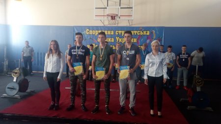 - Владислав Андрієнко в.к. 74 кг сума трьох вправ 385 кг;