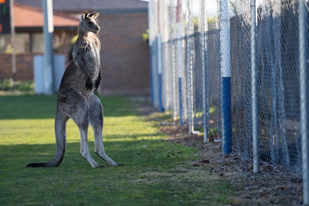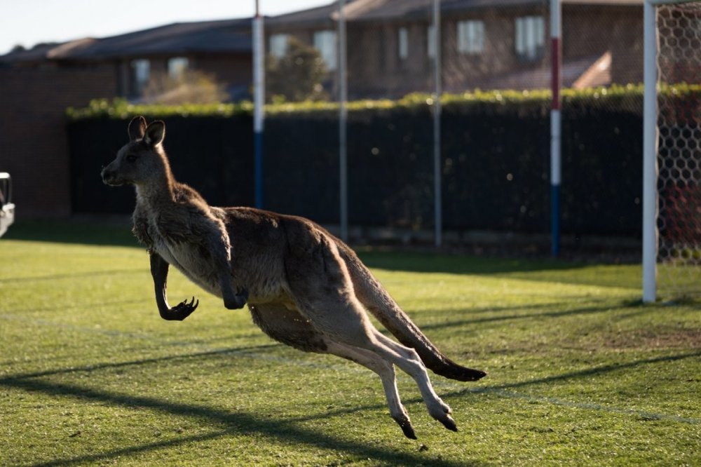 В Австралії під час футбольного матчу мі команндами Belconnen United Blue Devils і Canberra на поле вибіг кенгуру. Тварина перестрибнув через паркан влігся біля воріт. Це сталося в перерві коли команди пішли у роздягальню.